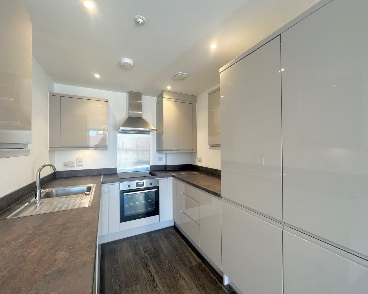 Kitchens are fitted to a full suite of whitegoods, including washing machine, fridge-freezer, oven and hob (with extraction over), and dishwasher. Gloss grey counters are all soft close, and the work surfaces are finished to a dark mineral effect