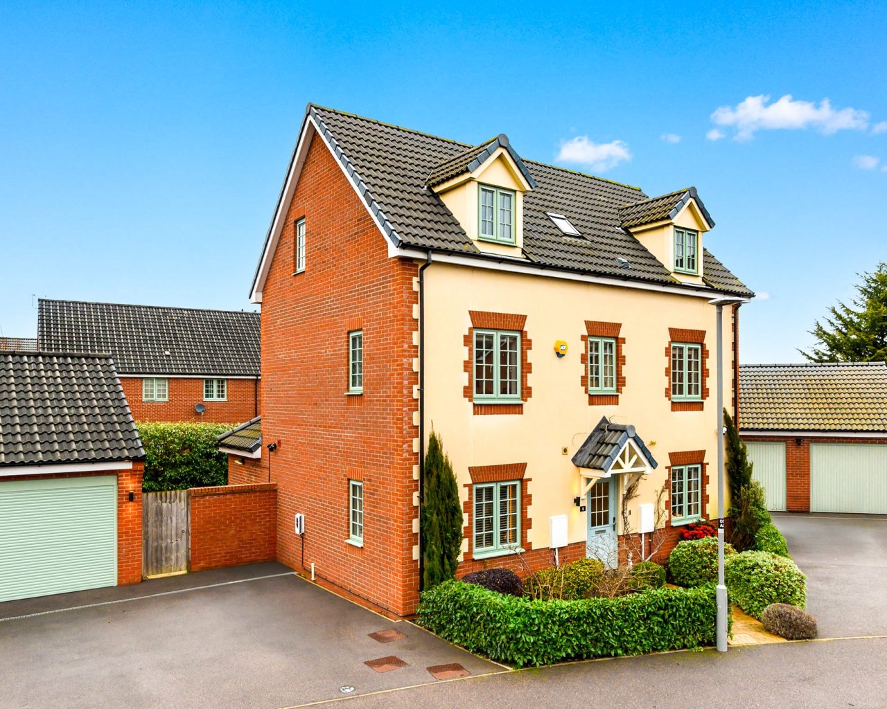 The ground floor accommodation comprises a welcoming entrance hall, cloakroom, sitting room, a spacious kitchen/dining room ideal for family life and entertaining, and a separate utility room. The original garage has been thoughtfully converted to provide additional gym/office space, offering excellent flexibility for home working or hobbies. On the first floor there is a landing serving bedroom one with en suite shower room, bedroom two with en suite shower room, and bedroom five.