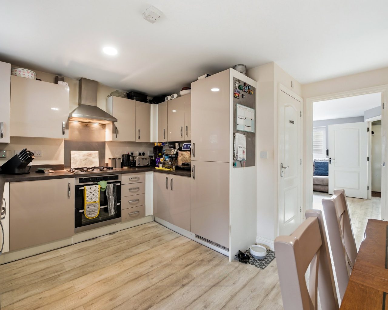 Outside, the rear garden has been thoughtfully landscaped for low-maintenance enjoyment, providing a pleasant space to relax or dine alfresco. To the front of the property are two allocated parking spaces, offering valuable off-road parking