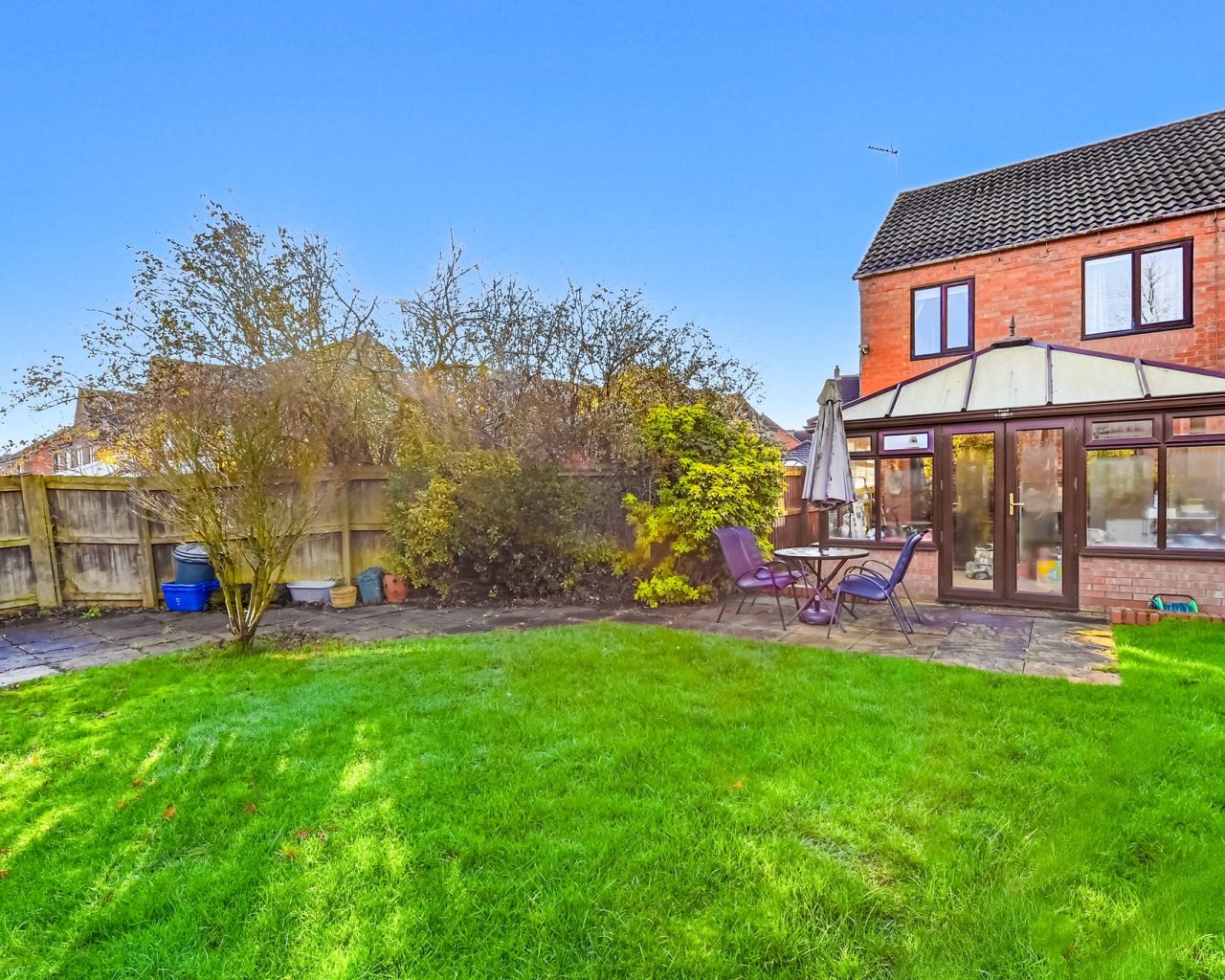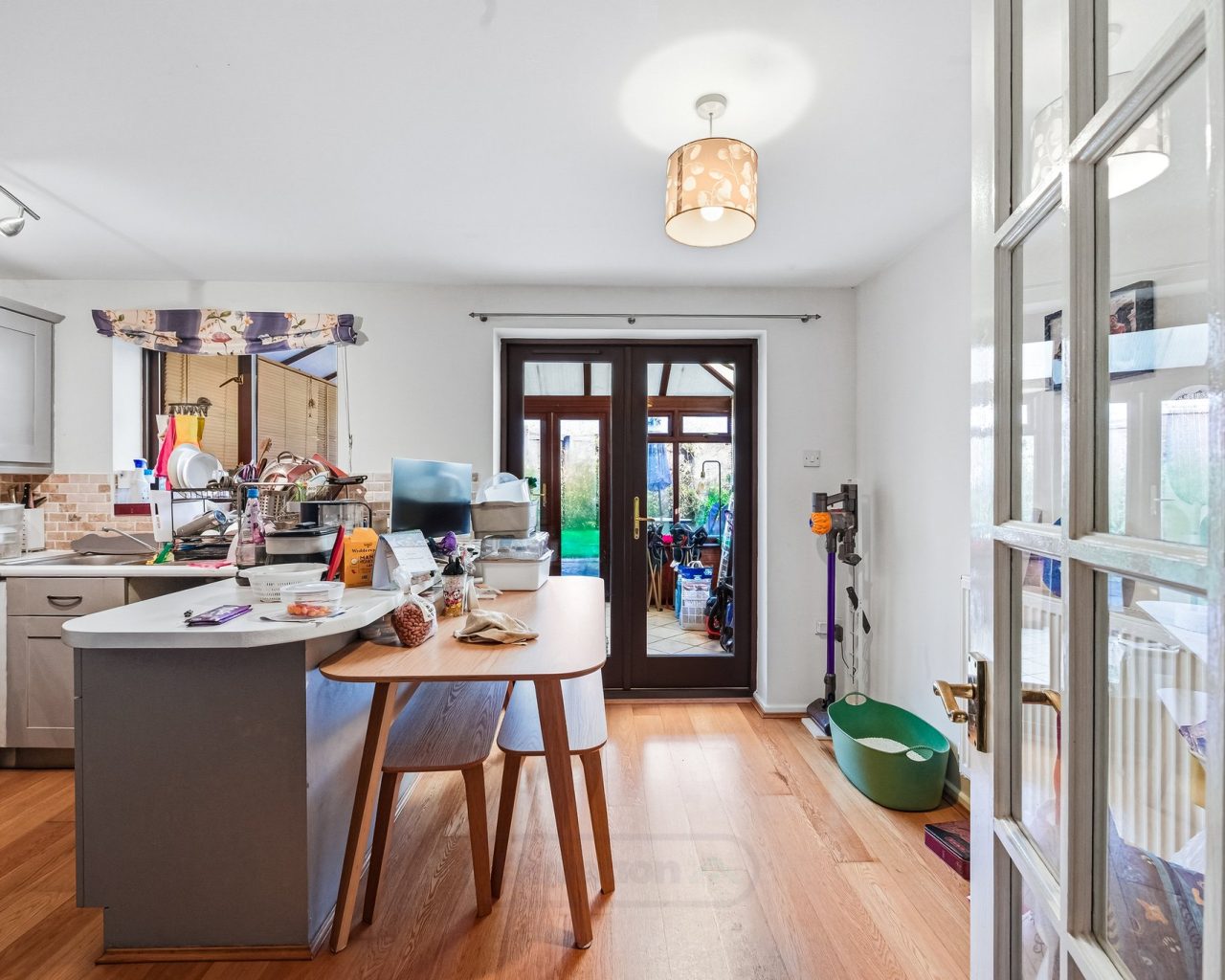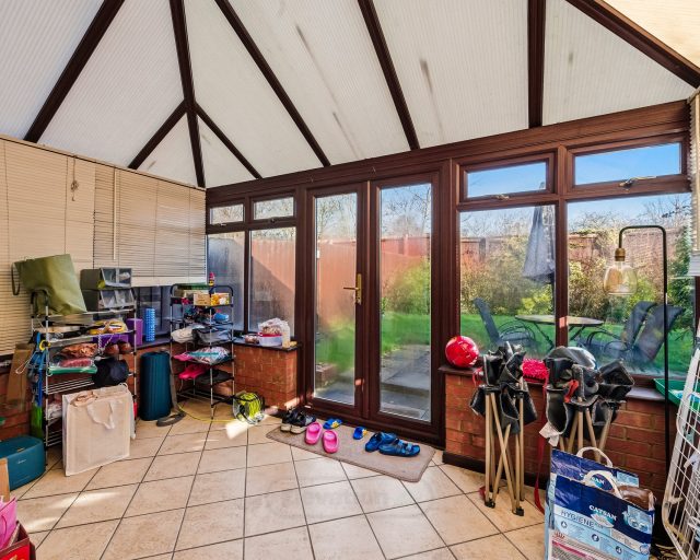 Flowing seamlessly from the kitchen is the conservatory, a fantastic additional living space flooded with natural light. With double French doors opening directly onto the garden, this room is perfect for use as a dining room, playroom, or relaxing garden room, effortlessly connecting indoor and outdoor living.