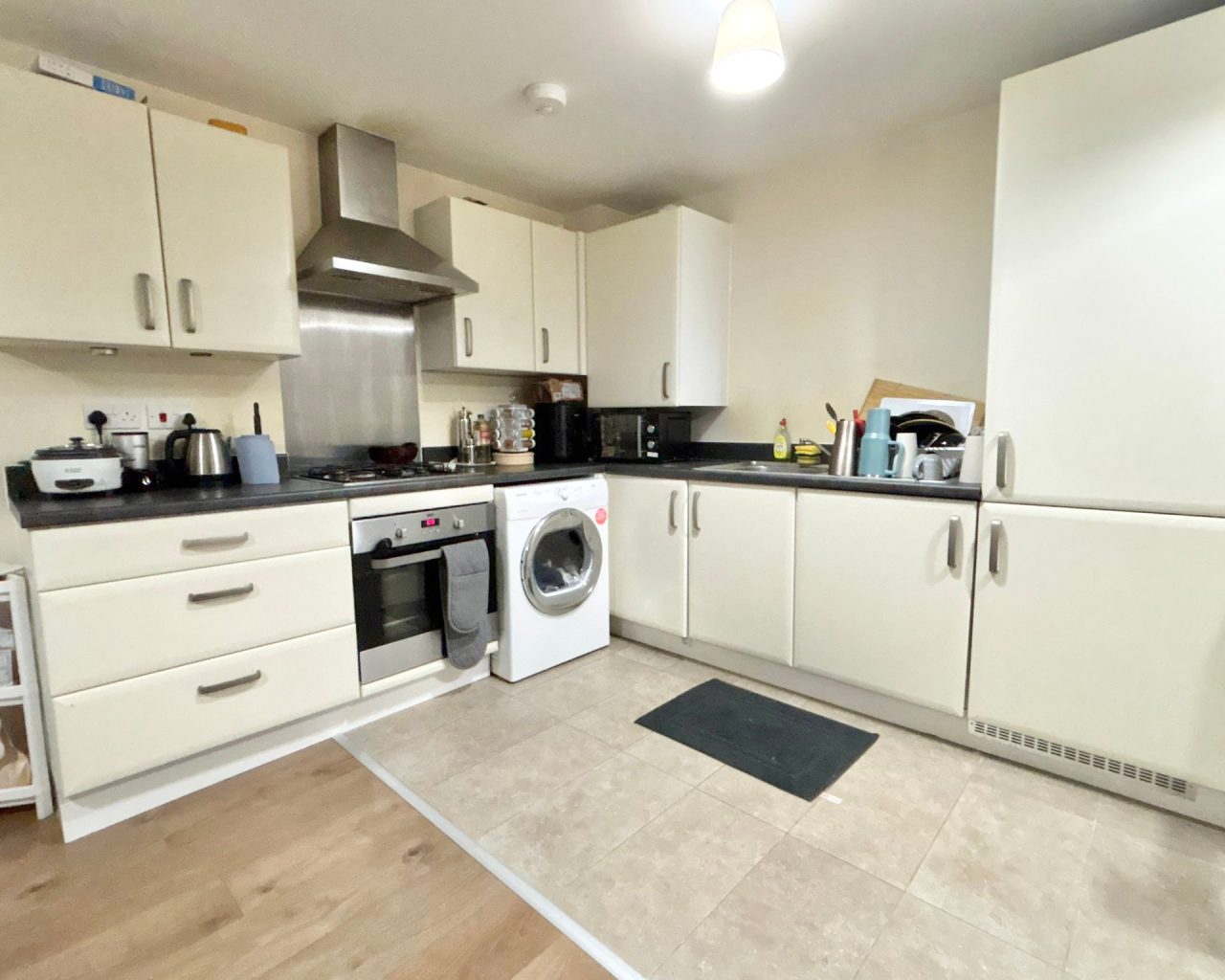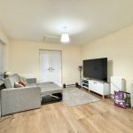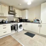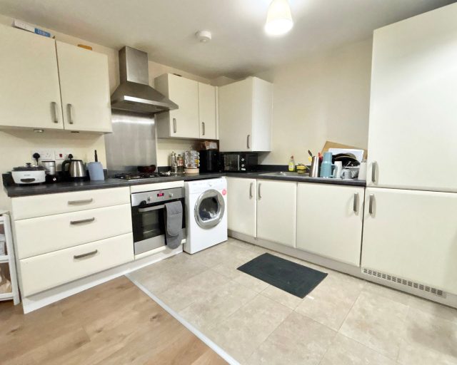 Open plan lounge and stylish fitted kitchen with built-in appliances on the first floor.