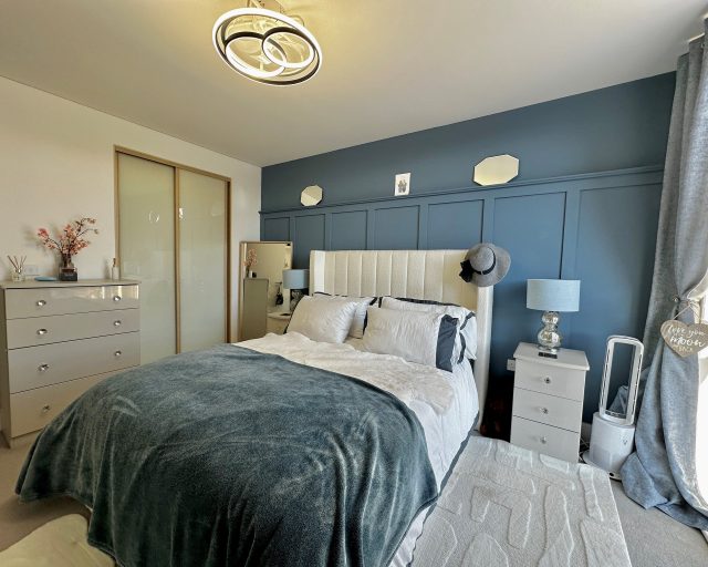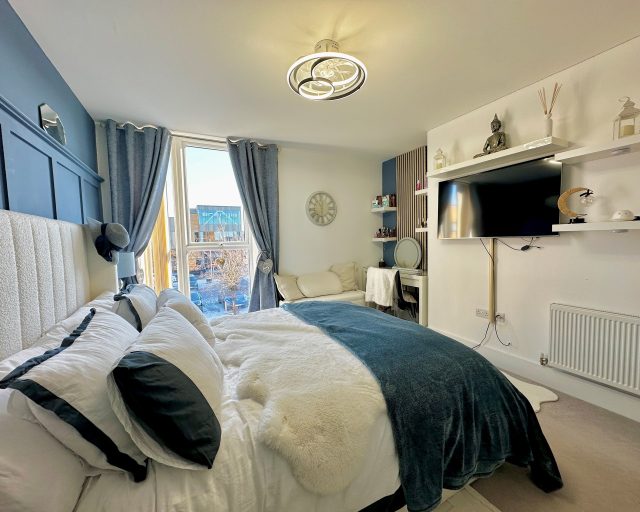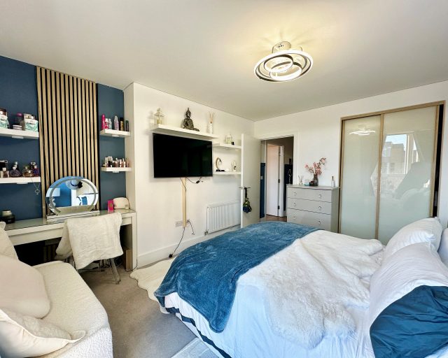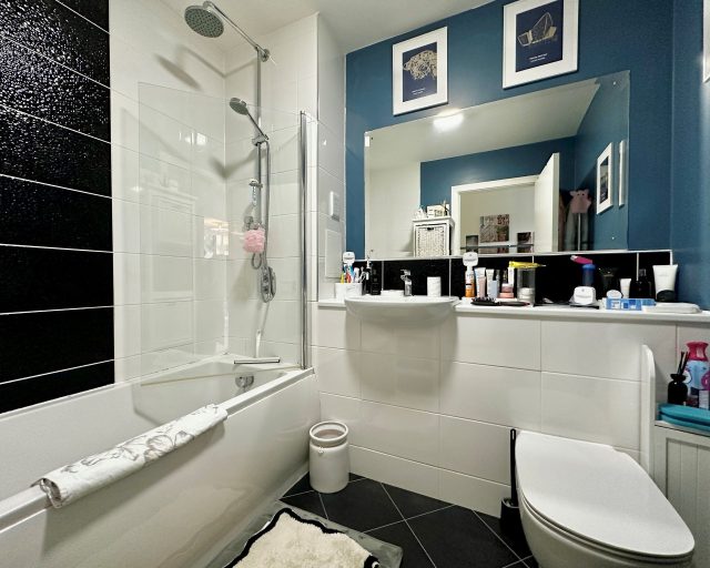 The bedroom is a spacious double, offering plenty of room for storage and furnishings. The contemporary bathroom features a well-appointed three-piece suite, including a bath with shower over, finished to a modern standard.