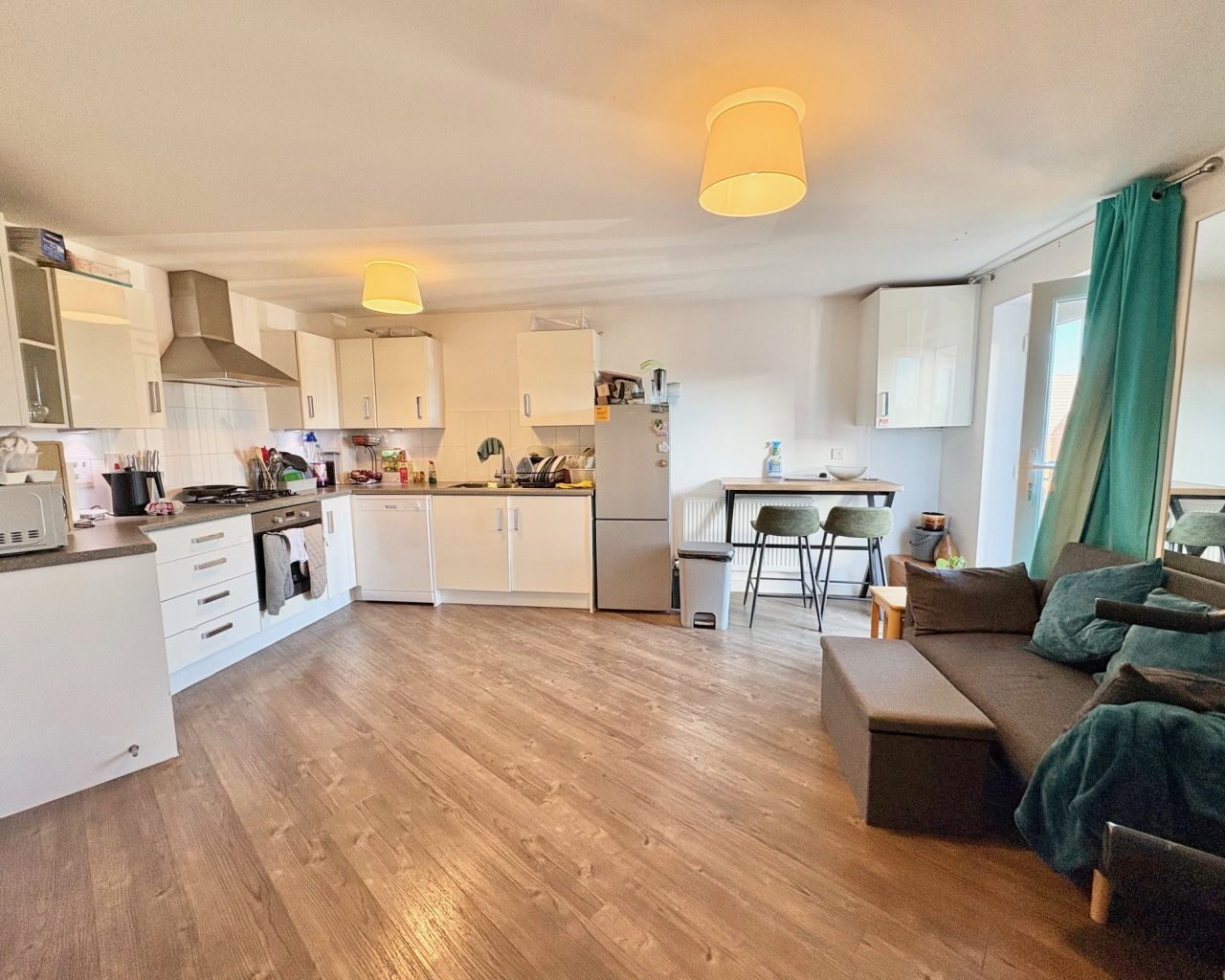 - Open-plan kitchen/living area with integrated appliances