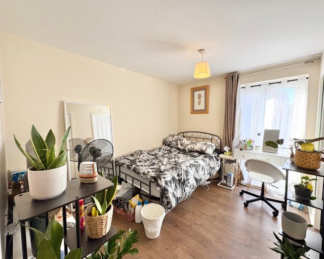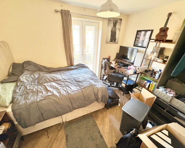 The master bedroom includes built-in wardrobes, its own Juliet balcony, and a private ensuite shower room. The second double bedroom also benefits from a Juliet balcony and is served by the main bathroom.