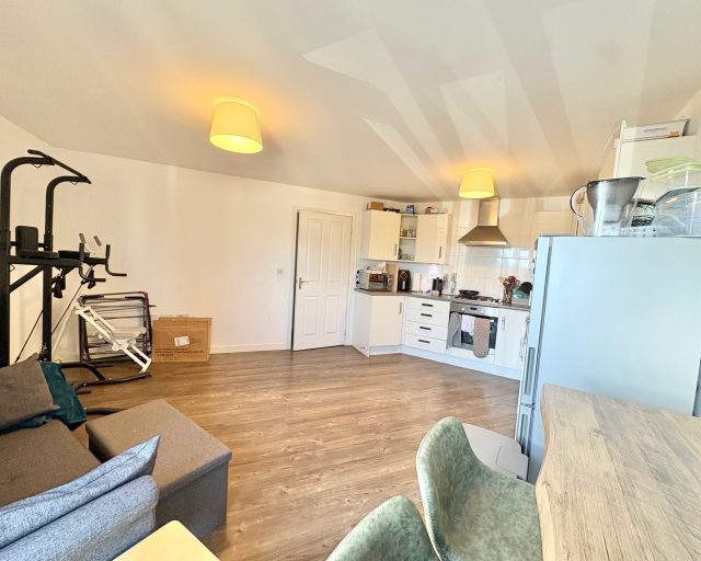 The property features an open-plan kitchen and living area complete with integrated appliances and a Juliet balcony that brings in plenty of natural light.