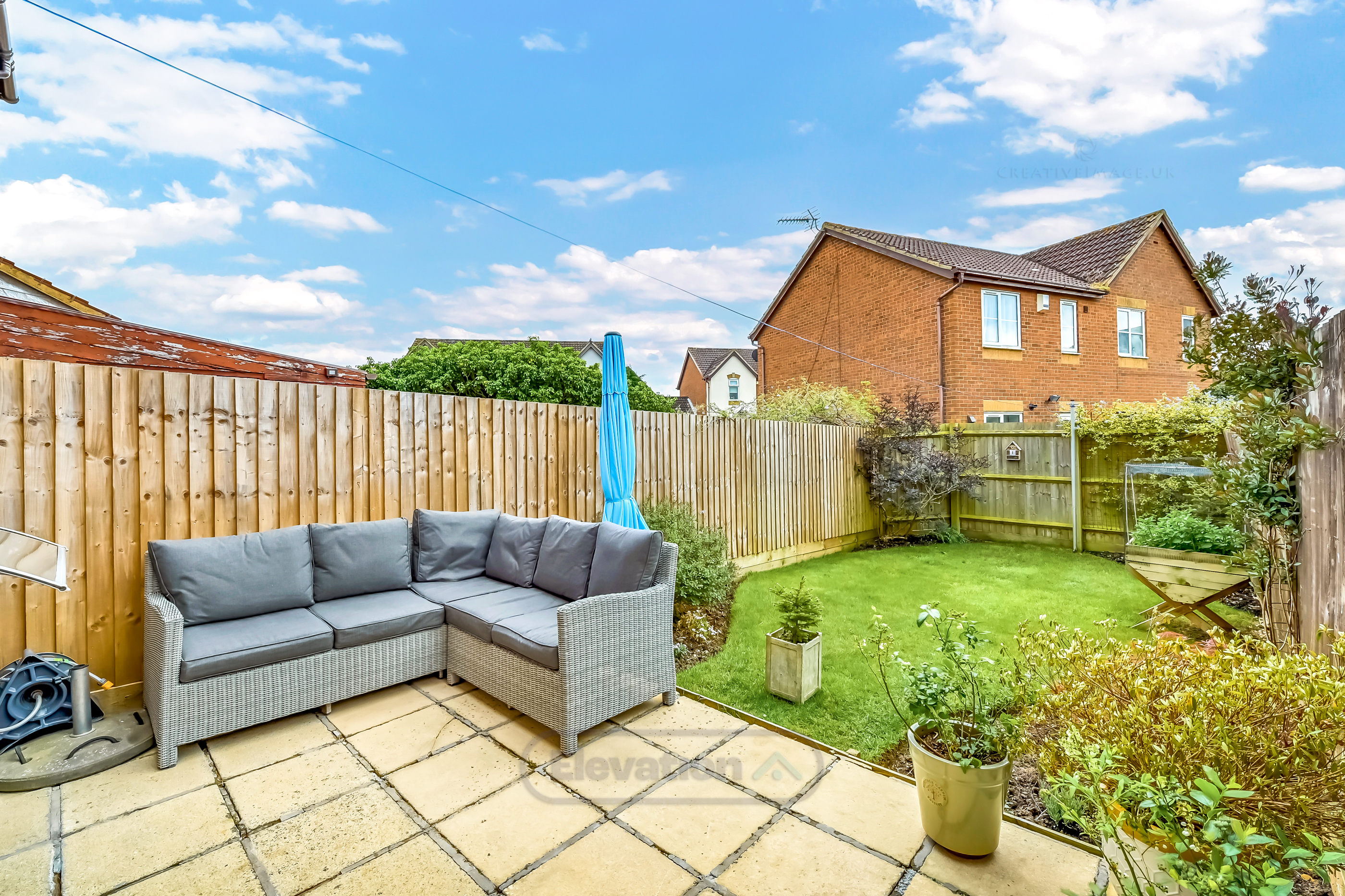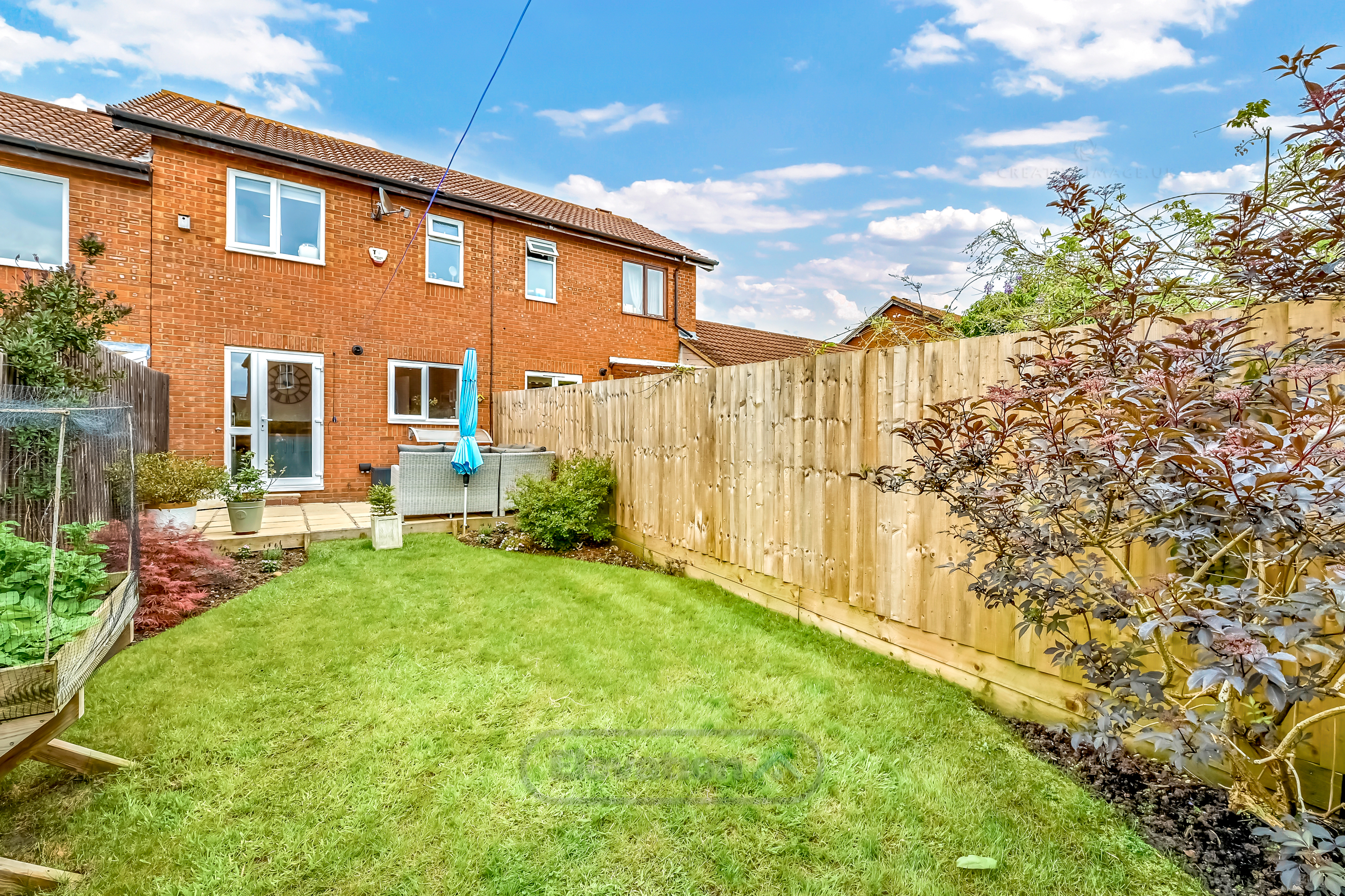 Outside, the property offers a private garden area accessed directly from the kitchen diner, ideal for outdoor dining and enjoying sunny days.