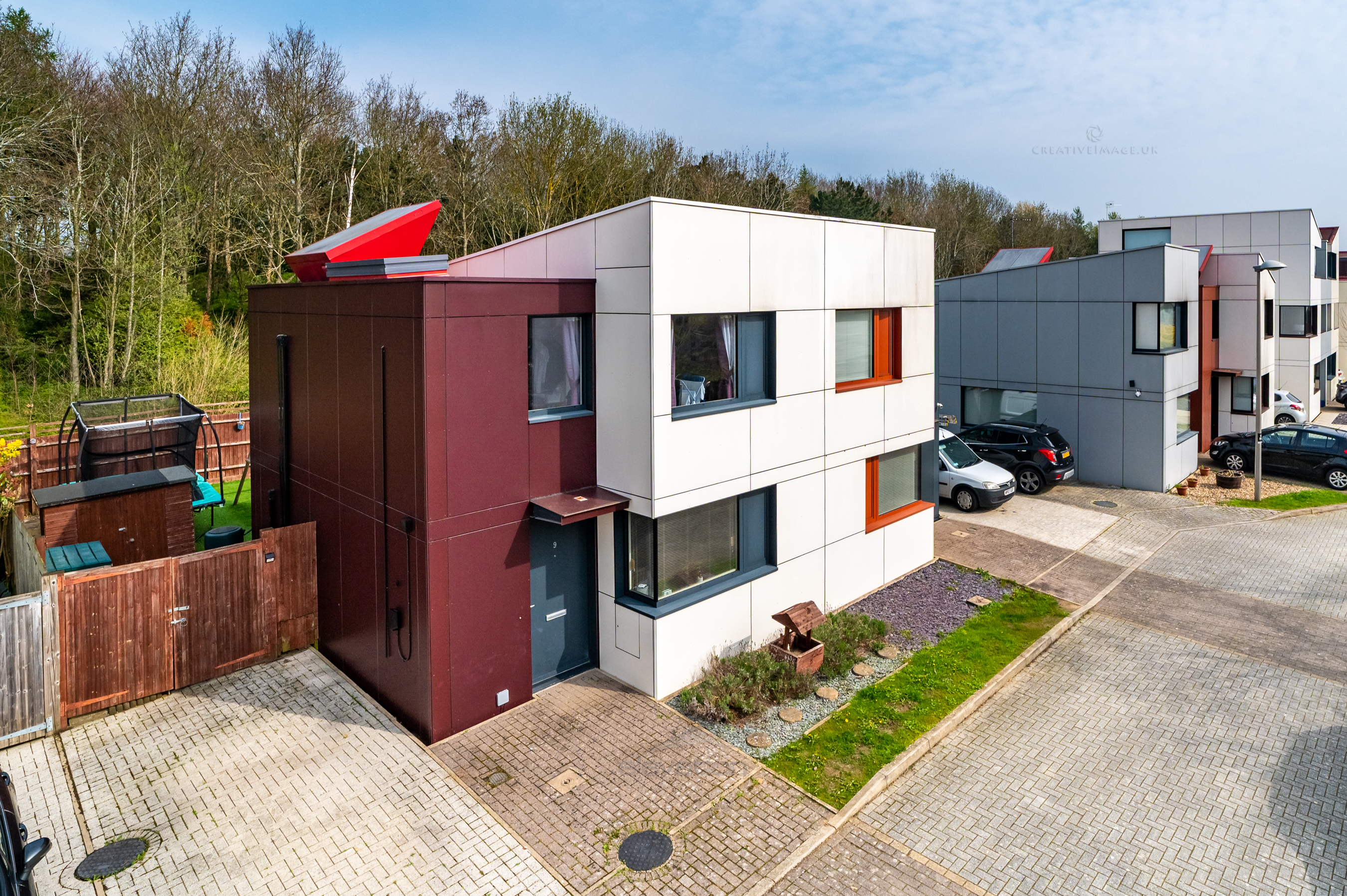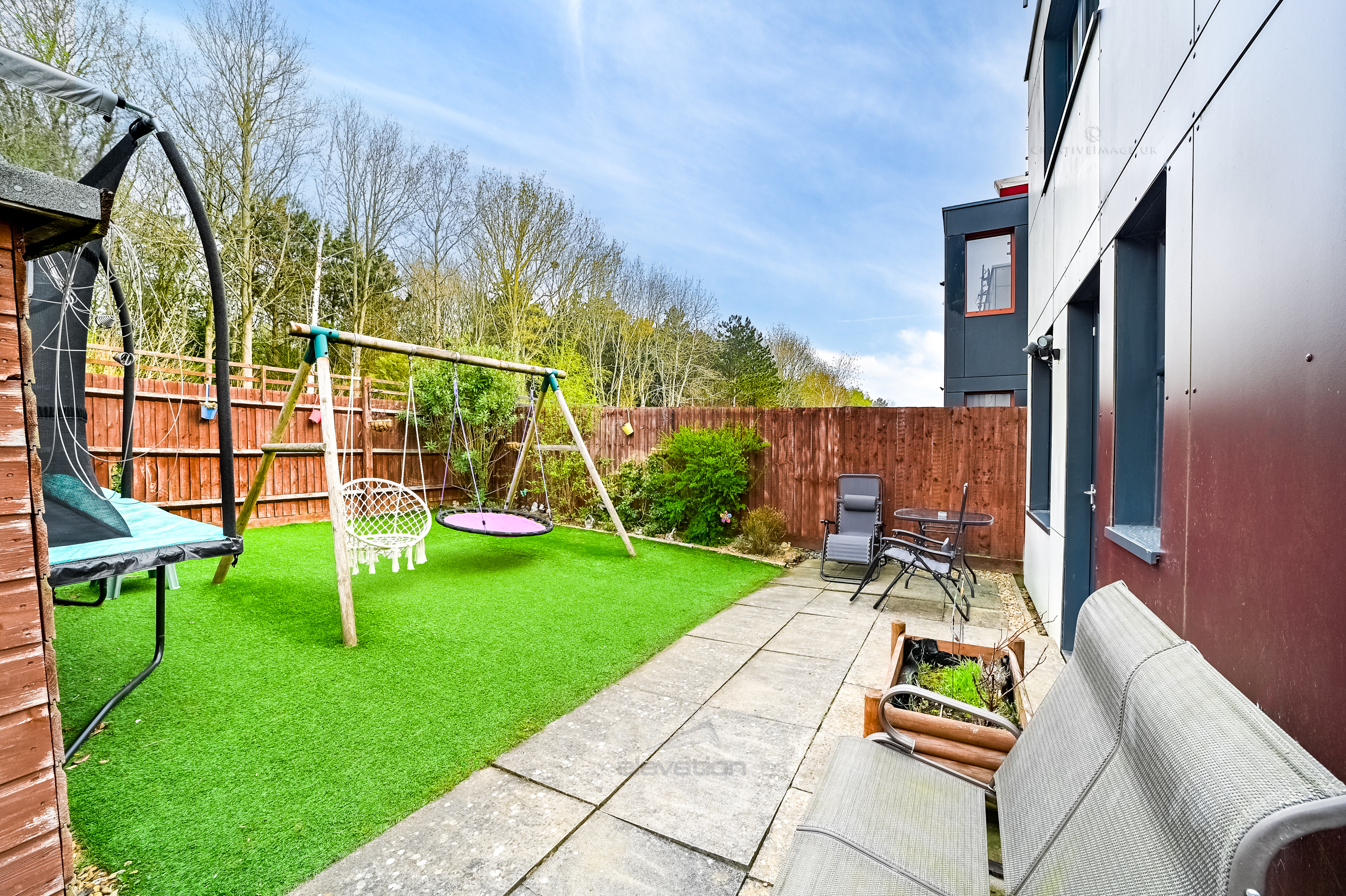 The large garden backs onto woodland and is low maintenance itself with astroturf and tiles. The property has EV charging to the front with space for two tandem parking spaces.