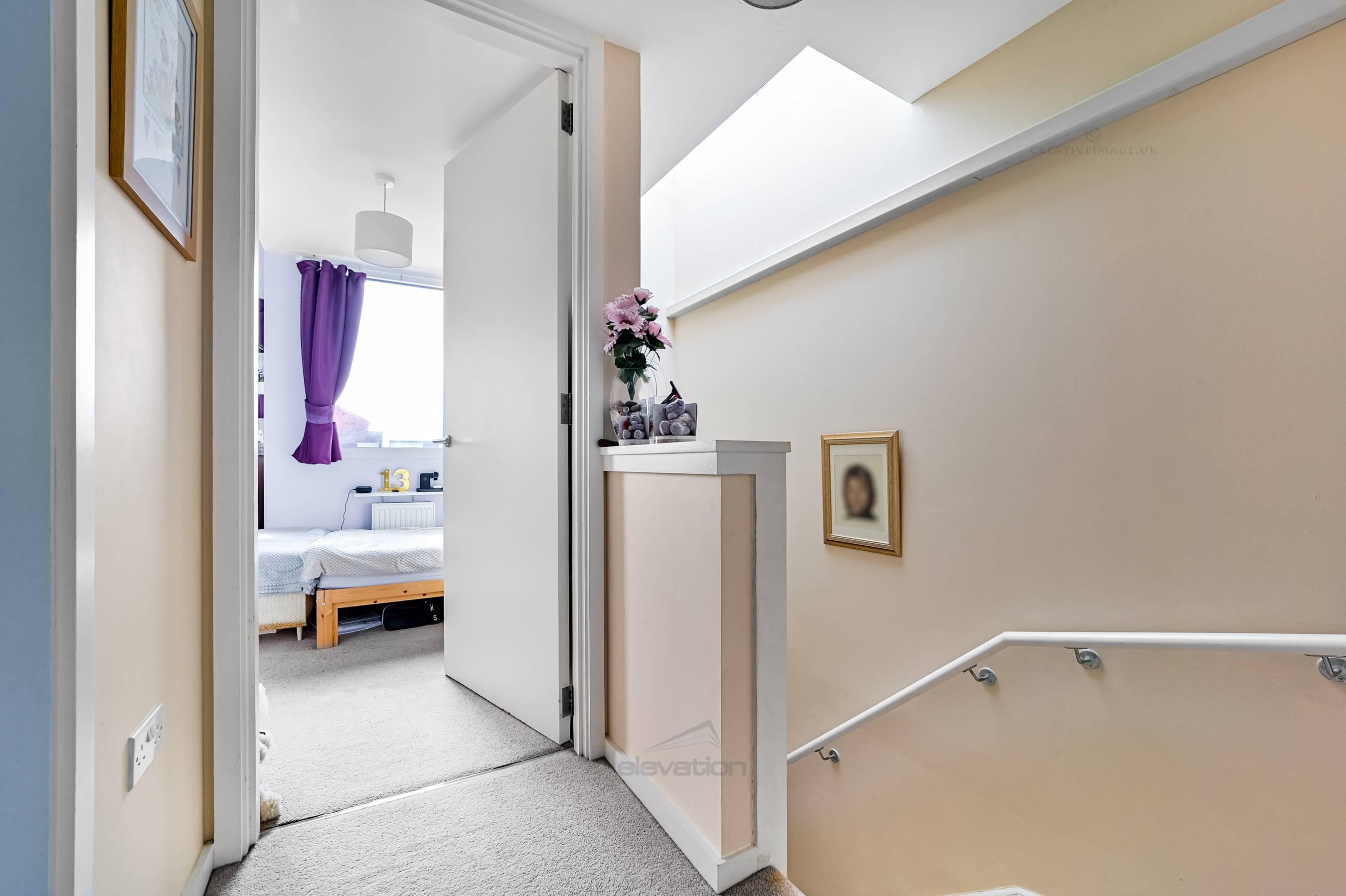 The stairs are lit up by a large skylight window above and lead to two double bedrooms alongside a family bathroom. Both bedrooms have access to Air Conditioning and feature high ceilings, helping the property feel more open, spacious and comfortable year-round.