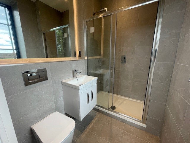 The master bedroom repeats the dual aspect windows and a fully tiled en-suite with large shower cubicle large back lit vanity mirror, chrome fittings and heated towel.