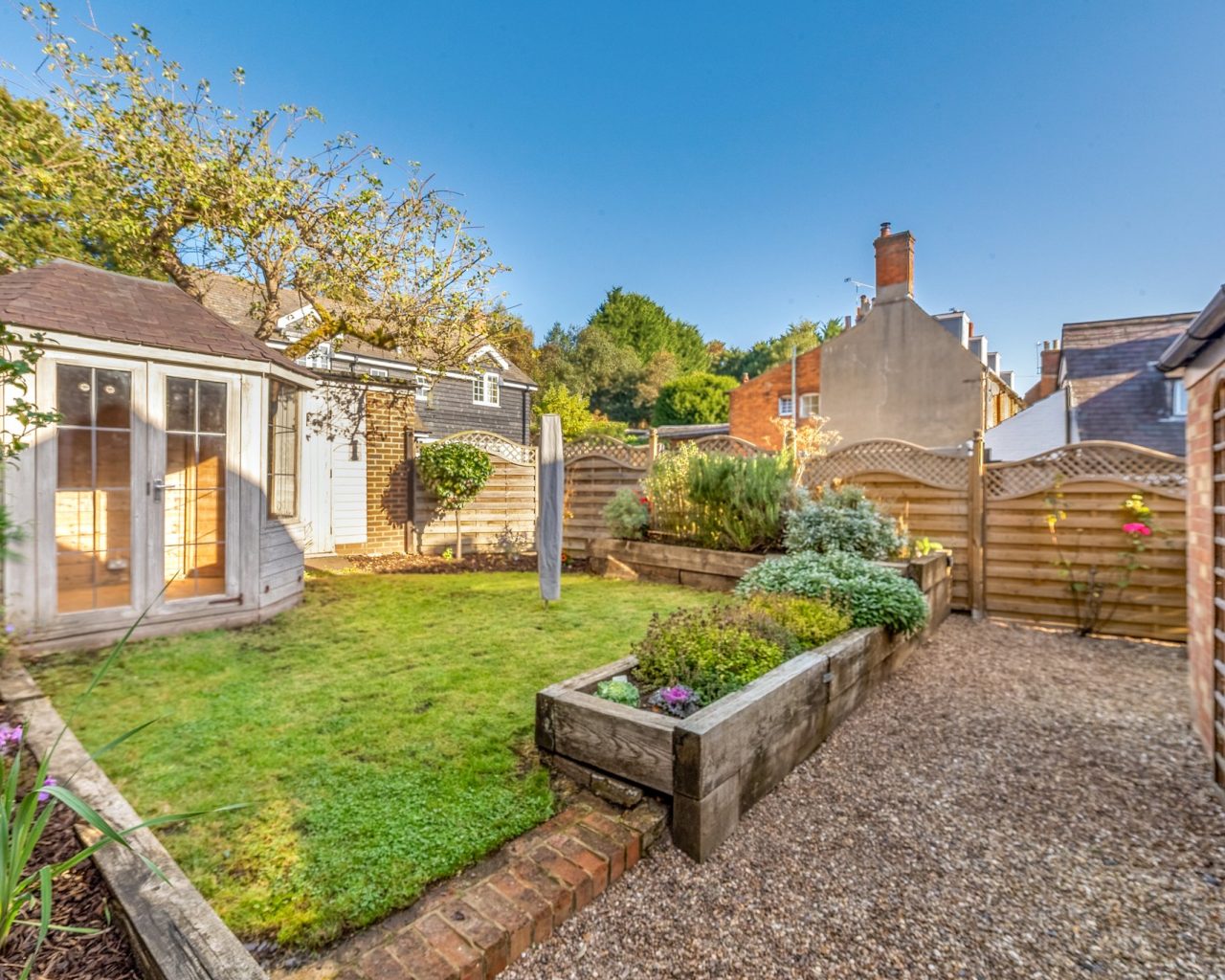Outside, the property boasts an enclosed part-walled garden with decking, raised borders, and a timber summer house—ideal for enjoying the warmer months. To the rear, a single detached garage offers secure parking and additional storage.